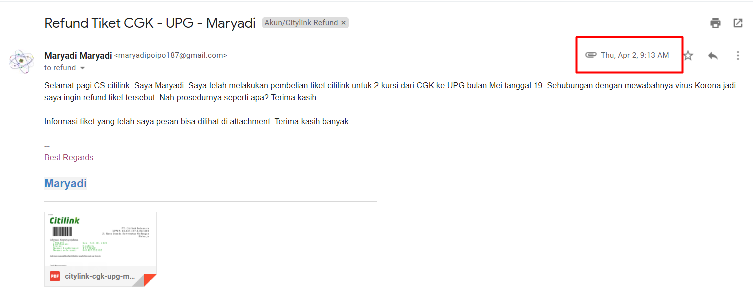 Nah... yang pertama yang saya lakuin adalah mengirimkan email ke refund@citilink.co.id tanggal 2 april seperti terlihat dibawah: